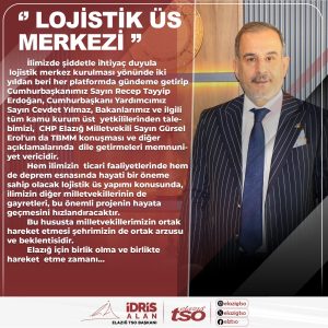 “İlimizde şiddetle ihtiyaç duyulan lojistik merkez kurulması yönünde iki yıldan beri her platformda gündeme getirip Cumhurbaşkanımız Sayın Recep Tayyip Erdoğan, Cumhurbaşkanı Yardımcımız Sayın Cevdet Yılmaz, Bakanlarımız ve ilgili tüm kamu kurum üst yetkililerinden talebimizi, CHP Elazığ Milletvekili Sayın Gürsel Erol’un da TBMM konuşması ve diğer açıklamalarında dile getirmeleri memnuniyet vericidir.