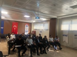 İl Afet ve Acil Durum Müdürlüğü personelinden Hikmet Bartan tarafından depremde arama ve kurtarma eğitmen eğitimi üst başlığında ‘insarag, emniyet ve güvenlik, ekipman’ konuları işlendi.