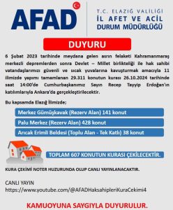 Elazığ Valiliği tarafından yapılan duyuruda Elazığ için 607 konutun kurasının çekileceği belirtildi.