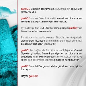 GakGO Hesabı üzerinden yapılan ilk paylaşımda; “Elazığ’ın marka şehir olması, Elazığ’a dair değerlerin uluslararası düzeyde bilinirliğinin artırılması şehrimizi bölgenin yıldız şehri yapacaktır. GakGO! bu bağlamda Elazığ’ın ev sahipliğinde küresel ölçekte şirketler, önemli şahsiyetler ve uluslararası örgütlerle iş birliktelikleri geliştirmek, kültür, sanat ve spora dair çalışmalar yapmak amacı ile kurulmuştur. GakGO!’nun bütün gayesi daha güzel ve daha iyi bir Elazığ’dır.” İfadelerine yer verildi.