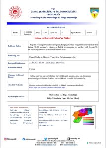 Meteoroloji 13. Bölge Müdürlüğünden yapılan açıklamada; “Elazığ, Malatya, Bingöl, Tunceli ve Adıyaman çevrelerinde 21.10.2024 13.00 – 22.10.2024 23.59 tarihlerinde fırtına, yer yer kuvvetli fırtına ile birlikte çatı uçması, ağaç ve direklerin devrilmesi gibi olumsuzluklara karşı dikkatli ve tedbirli olunmalıdır.” ifadelerine yer verildi.