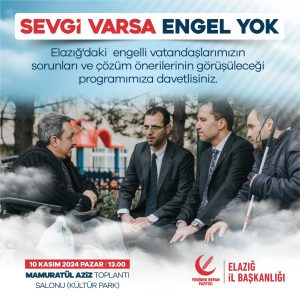 Yeniden Refah Partisi Elazığ İl Teşkilatı, Elazığ’daki engelli bireyler ile sivil toplum kuruluşlarının katılımıyla “Sevgi Varsa Engel Yok” adlı bir program düzenleyecek.
